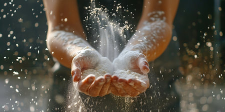 Close-up of hands holding and sifting white powder, symbolizing baking or sports preparation.
