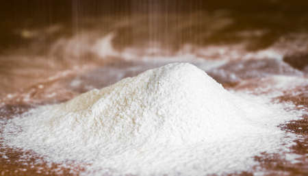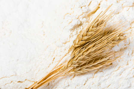 Close-up of a heap of flour and ears of wheat after sifting. Concept Record prices and high prices for bakery products. Rising wheat prices in Europe.