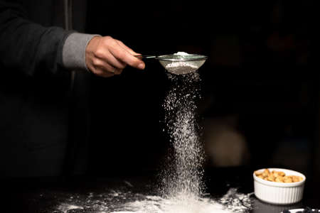Flour is poured through a sieve on a dark background. Making dough for cooking