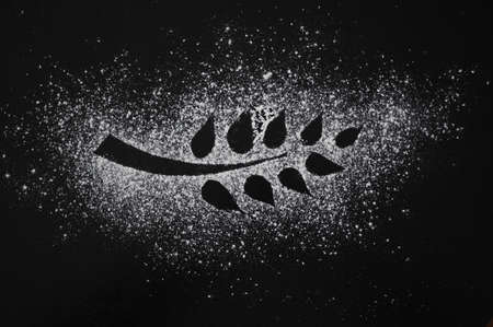 Flat lay view of plain flour in a shape of a wheat plant on black wooden table.
