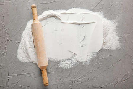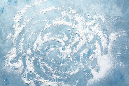 Scattered flour in form oval with inscription clean on a gray decorative plaster background.