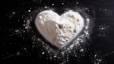 Heart of flour on a black background. Love and Valentine's Day concept.