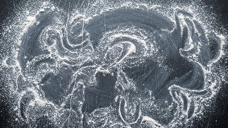 White flour scattered and swirled in abstract patterns on a dark slate surface, suggesting baking or culinary preparation.