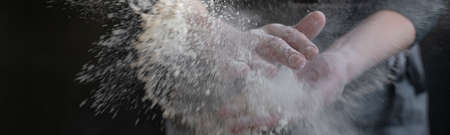 Close-up of a man's hands in flour on a dark background