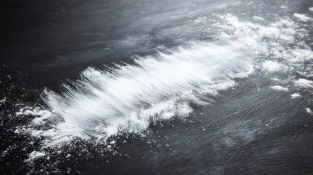 Artistic black and white image showcasing a fine white powder spread artistically across a dark surface, creating an intriguing contrast and texture.