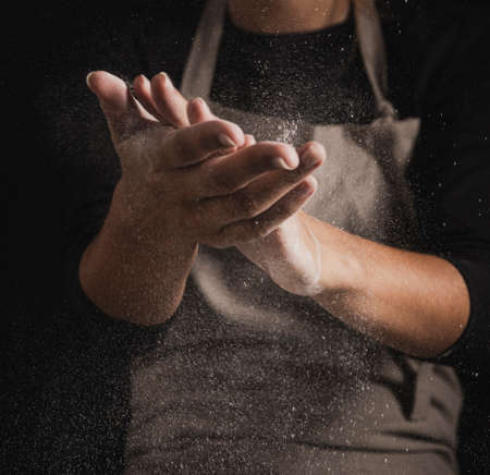 chef in black uniform sprinkles white wheat flour in different directions, product scatters dust, black background, particles scatter and freeze in the air