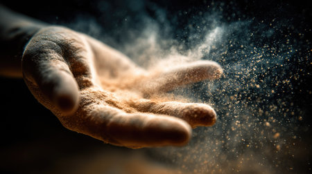 A close-up captures a hand releasing fine particles, creating a dynamic visual effect. The hand's texture contrasts with the blurred, scattered elements. The lighting highlights the particles against a dark background, suggesting a studio setting. This image could be used for various projects, emphasizing texture, motion, or concepts.