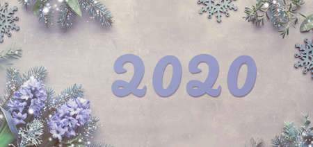 Top view on winter concrete background with fir twigs, blue hyacinth flowers, snowflakes and winter herbs. Flat lay with number 2020, panoramic image, banner composition.