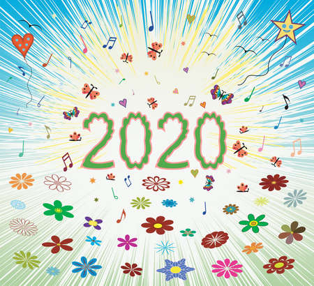 Happy spring summer 2020 sunrise abstract colorful background with bloom blossom number letters 2020. Cover for calendar, greeting card, web page, holiday background. EPS file available.