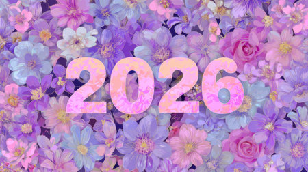 A vibrant floral background featuring an array of colorful flowers in shades of purple and pink with the text 2026 prominently displayed. Perfect for celebrations.