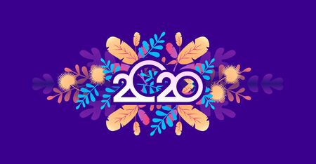A vibrant floral design featuring numbers 2020, adorned with pink flowers and leaves, creating cheerful and festive atmosphere