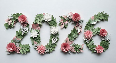 The numbers 2026 are artfully crafted from lush green foliage and beautiful pink and white flowers against a neutral background.