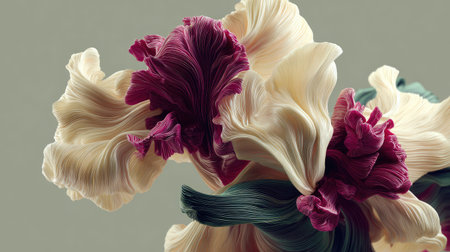 A stunning floral arrangement featuring flowing petals in soft cream and bold purple, set against a muted background, embodying elegance and natural beauty.