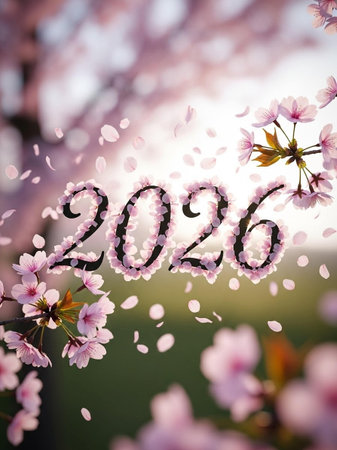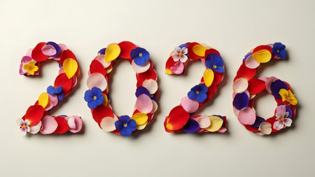 The numbers 2026 are artfully arranged using colorful flower petals on a light background.