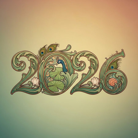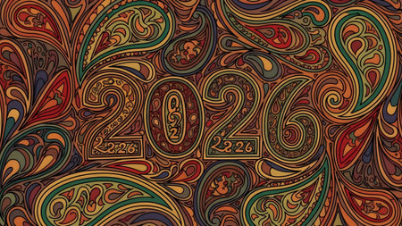 The number 2026 is presented within an intricate and colorful paisley pattern background.