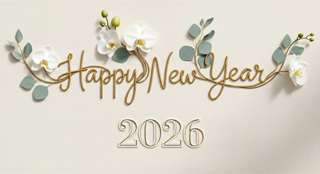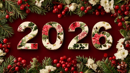 Celebrate happy new year 2026 with stylish floral ornament on cream wall. Expressing festive cheer and botanical elegance. Great design template for holiday.
