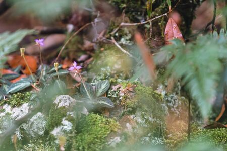 Tiny pink flowers on the ground with moss and green leave in the rainforest of Hala-Bala wildlife sanctuary, Yala, Thailand.
