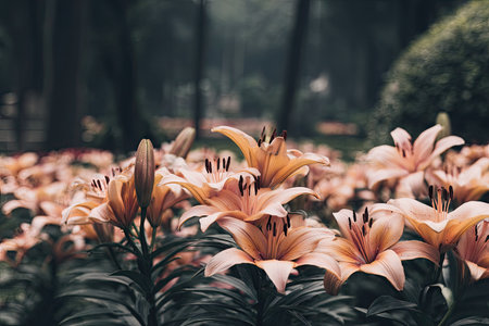 Close-up view of a cluster of peach-colored lilies in a garden. The flowers are in focus, with the background slightly out of focus, creating a soft, dreamy effect. The image highlights the details of the petals and the delicate nature of the blossoms.