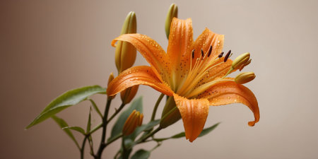 A vibrant orange lily showcases its elegant petals and intricate patterns in soft, warm light. The flower leans gracefully with green leaves accentuating its beauty.