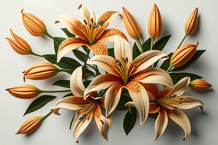 White lily flowers on white background, flower pattern, copy space and space for text mothers day greeting card, womens day, wedding. Generative AI