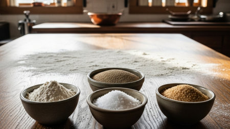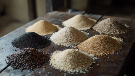 AI Generated. Variety of flours displayed on a wooden tray in a rustic setting