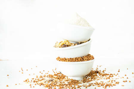 Organic superfood concept with raw buckwheat, oatmeal and corn flour on wooden background