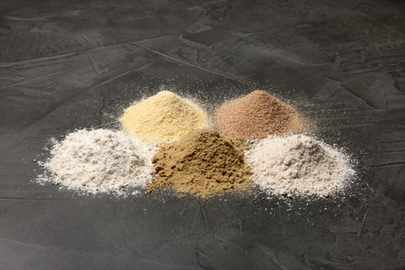 Piles of different flour types on gray table