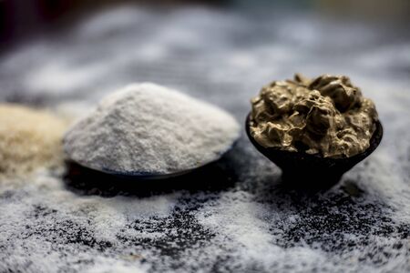 Face mask for glowing skin on wooden surface consisting of rice flour & dried orange peel powder in a glass bowl along with some rice flour spread on the surface for greater effect.Horizontal shot.