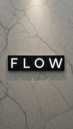 This image showcases the word 'FLOW' in illuminated letters against a sleek marble backdrop, perfect for conveying creativity and elegance in modern design.