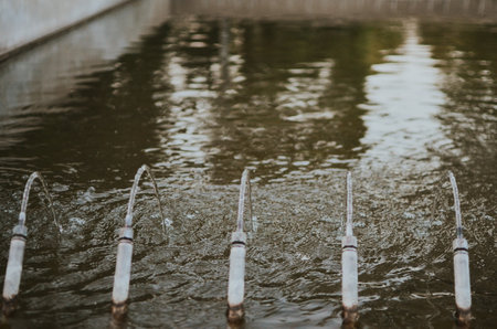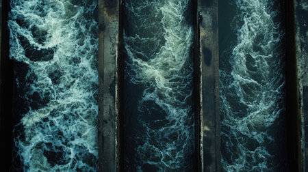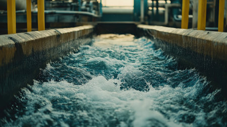 Captivating image of flowing water in an industrial setting, showcasing the vigorous motion and splashes that emphasize the dynamic energy of the purification process.