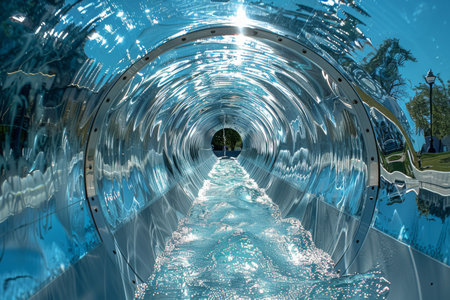An enchanting and mesmerizing view of a clear water slide tunnel, brilliantly illuminated with dynamic lighting effects