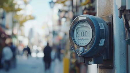A close-up of a parking meter in an urban street, capturing the essence of city life and everyday activities, blending modern technology with daily routines.
