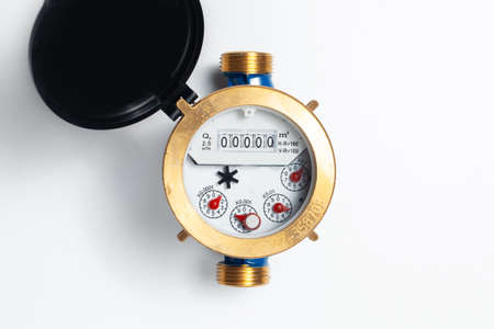 Close-up of water meter for cold water on white background.