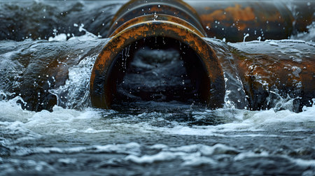 Close-up of dark fluid gushing from corroded metal pipes into a water body, symbolizing environmental impact.