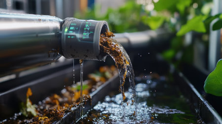 Dark wastewater is pouring from a rusty pipe into a tank, creating foam and bubbles, symbolizing industrial pollution and environmental damage