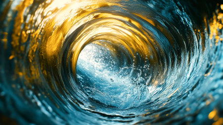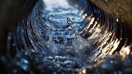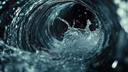 This stunning image captures the dynamic motion of water swirling within a dark tube, showcasing splashes and ripples that evoke a sense of energy and fluidity.