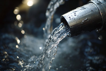 This image captures the dynamic flow of water cascading from a pipe, creating mesmerizing splashes and reflecting light. The industrial setting adds a unique atmosphere to this visual.
