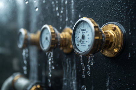 Detailed close up of water pipes and gas meters with water droplets and brass elements