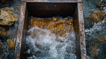 A rusty metal chute channels clear water as it flows over smooth rocks, creating bubbles and ripples in a natural stream. The scene captures the beauty and tranquility of nature.