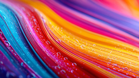Dynamic abstract background displays flowing parallel waves of intense neon colors like cyan magenta yellow and purple intersected by glistening clear water droplets creating a mesmerizing three dimensional wet texture perfect for digital art or modern graphic design projects requiring bold saturated visual impact and intricate surface detail.