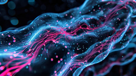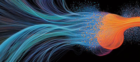 This abstract image features a dynamic flow of glowing particles on a dark background, creating an ethereal and vibrant visual effect. Ideal for various artistic and technological themes.