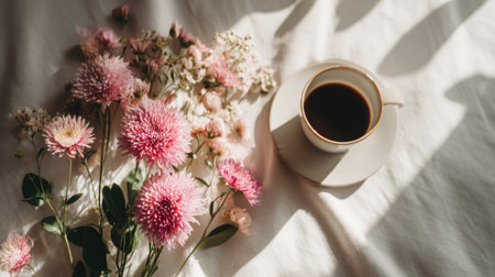 A fresh coffee cup sits beside vibrant pink flowers, creating a calm and inviting morning atmosphere.