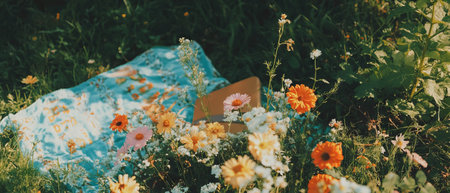 Colorful wildflowers and picnic blanket create a cheerful outdoor gathering experience