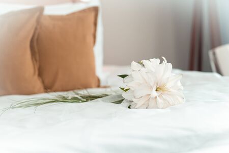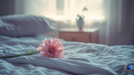 A delicate pink flower lays gracefully on a white bedspread, bathed in soft morning light. The cozy bedroom atmosphere invites tranquility and elegance.