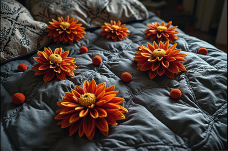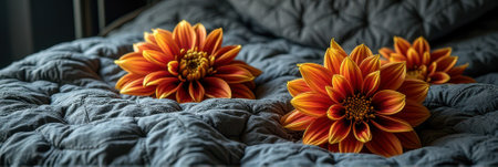 Vibrant orange dahlias on plush gray quilt in cozy bedroom setting. That the image is generated using AI.
