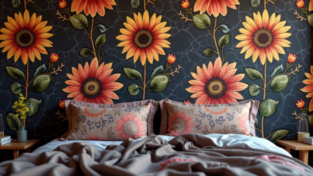 Cozy bedroom with sunflower wallpaper and plush bedding. That the image is generated using AI.