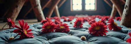 Sunlit attic with red gerbera daisies on a cozy cushion. That the image is generated using AI.