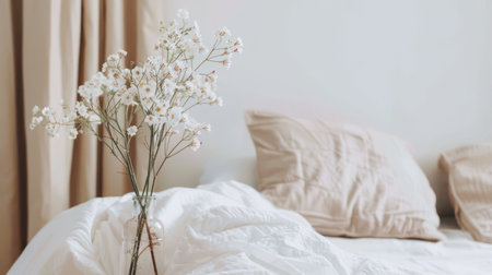 A bouquet of small white flowers in a glass vase sits on a bedside table next to a bed with white sheets and pillows. The flowers are in focus, while the bed and pillows are slightly blurred in the background. The image has a soft, airy feel and suggests a peaceful and relaxing atmosphere.