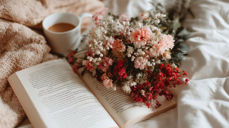 A serene morning setting featuring an open book surrounded by fresh flowers, a warm cup of coffee, and soft blankets, creating a perfect relaxation space.