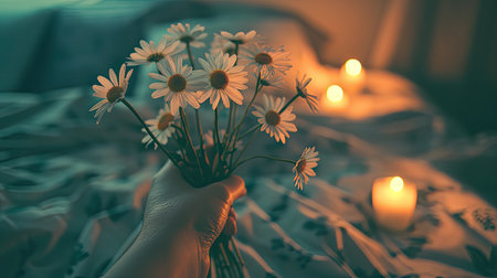 cozy, dimly lit bedroom adorned with candles and flowers delicately arranged on the nightstand, evoking an enchanting atmosphere perfect for Valentine's Day